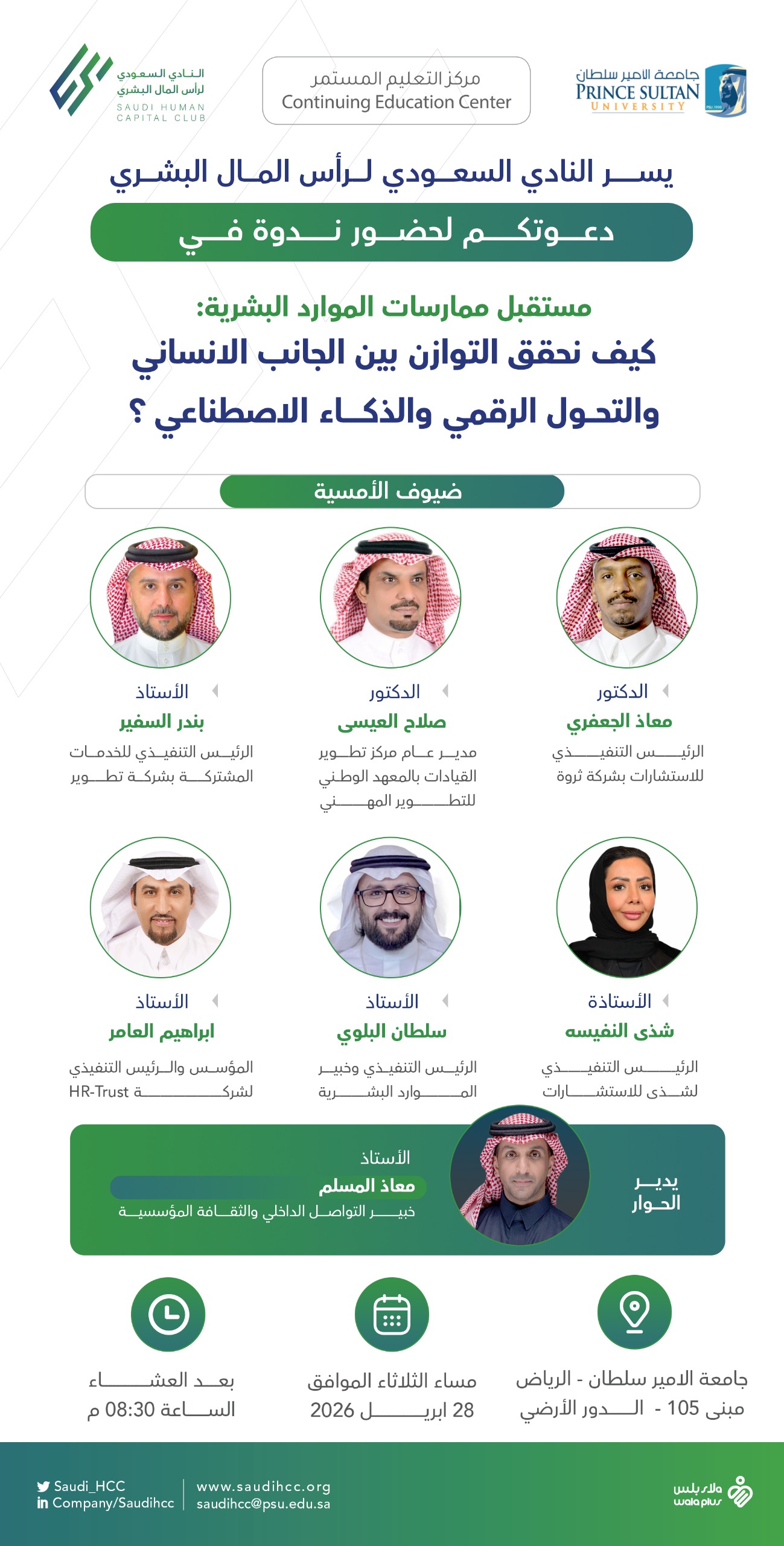 - تسعى الندوة إلى تقديم إجابات عملية ورؤية مستقبلية متوازنة، تجمع بين الاستفادة من التقنية والحفاظ على الجانب الإنساني في إدارة رأس المال البشري.